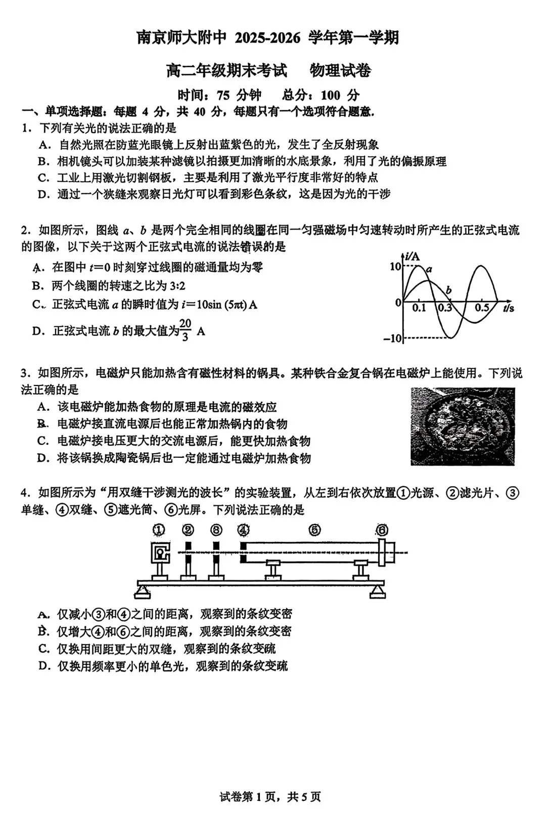 南京师大附中2025-2026学年高二上学期期末物理