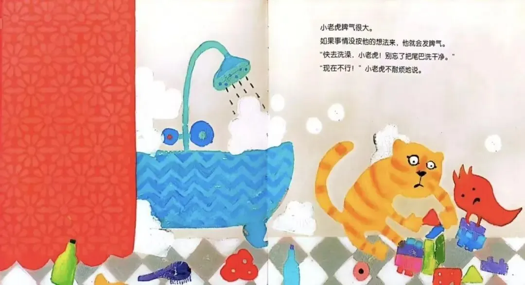 傍晚,妈妈说:“快去洗澡,小老虎!别忘了把尾巴洗干净。”小老虎不耐烦地说:“现在不行!”