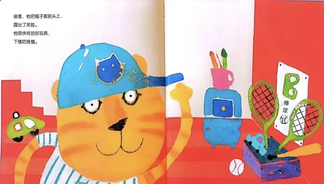 接着,他把帽子戴到头上,露出了笑脸。他很快收拾好玩具,下楼吃晚餐。