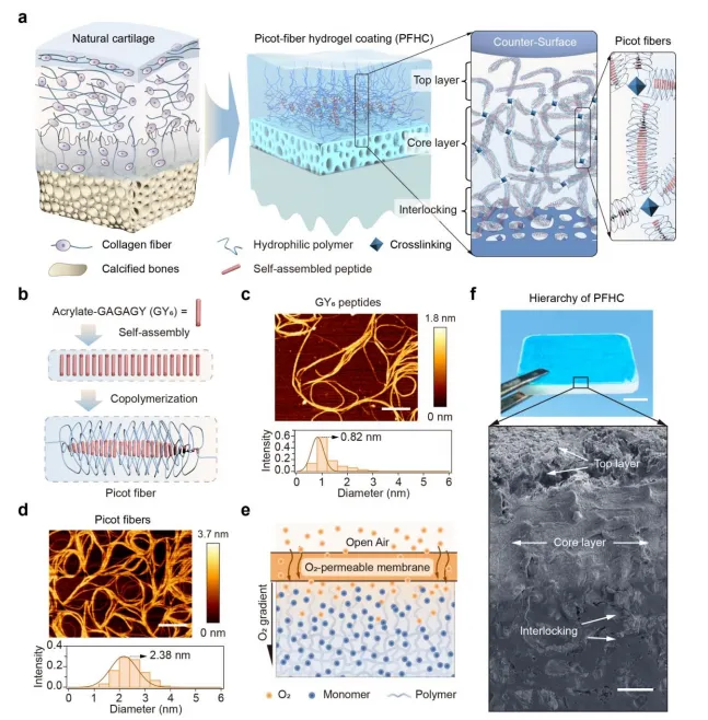 仿生层级结构设计:受天然软骨"凝胶状表层+胶原纤维增强区"结构启发,首次将picot纤维网络与梯度多孔结构相结合,实现润滑与承载功能的空间解耦。