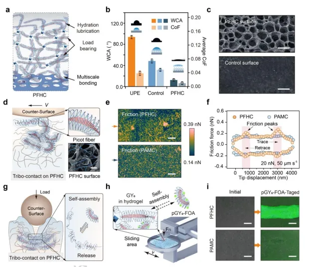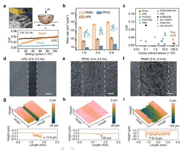 突破传统性能权衡:PFHC同时实现超低摩擦(CoF~0.009)和高耐磨性(磨损率比UPE低一个数量级),克服了水凝胶涂层长期存在的"润滑-耐久"矛盾。