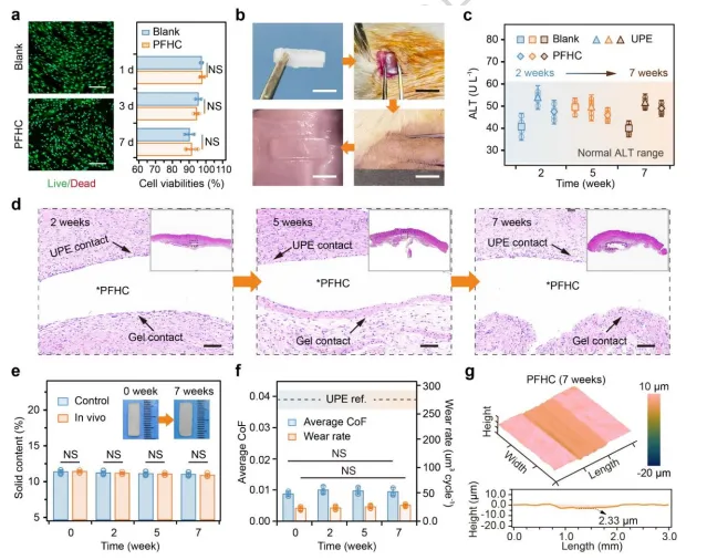 优异的体内稳定性:大鼠皮下植入7周后,PFHC保持结构完整、机械性能和润滑性能稳定,无免疫排斥或组织增生,满足长期植入应用要求。