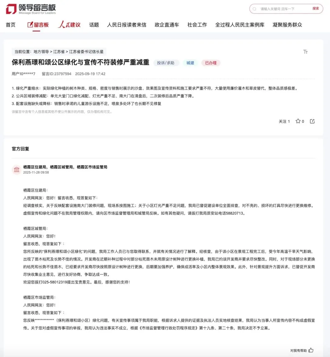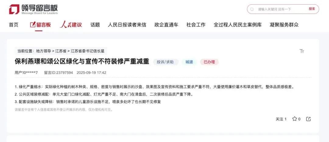 2025年9月19日,南京保利燕璟和颂项目一名业主通过人民网领导留言板向江苏省委书记提交留言,正式投诉该项目交付后存在的多项品质问题,希望相关部门介入核查并推动整改。