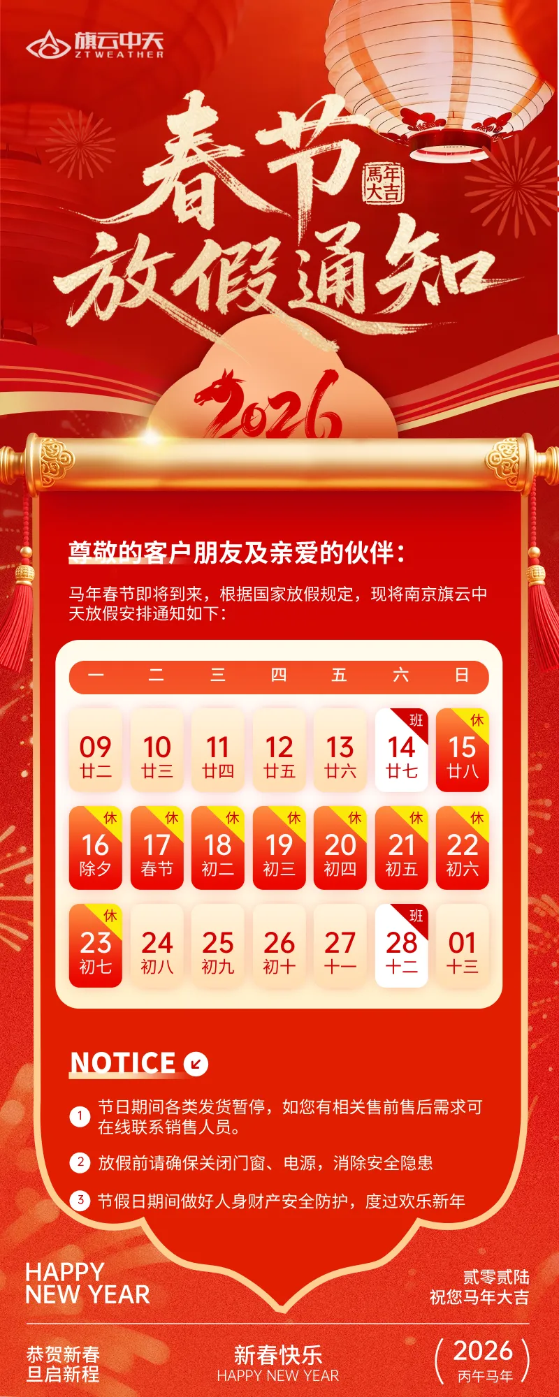 南京旗云中天2026春节放假通知