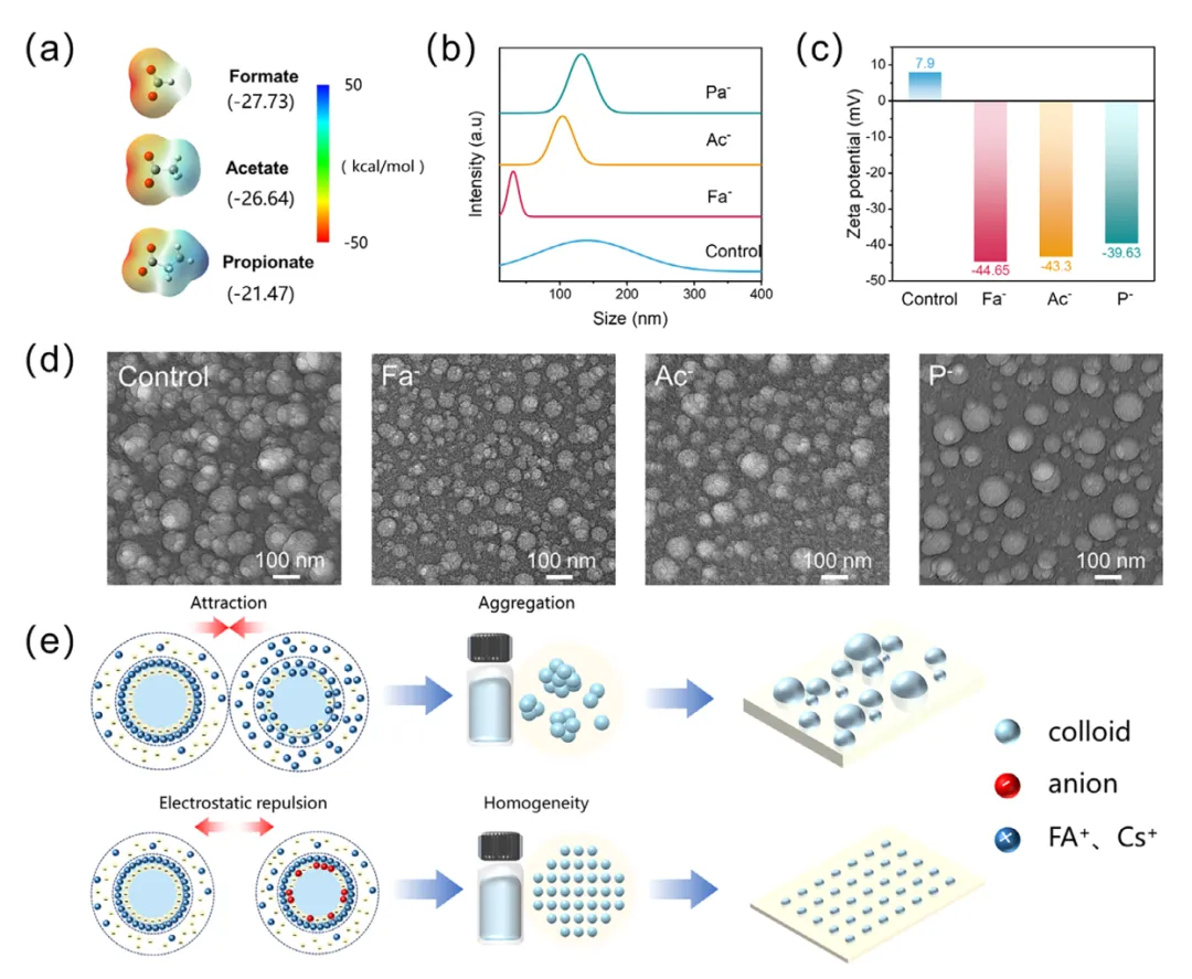 图1 (a)Fa-,Ac-,P-的化学结构和静电势光谱图像。(B)具有不同离子盐的钙钛矿前体溶液的DLS分析。(c)具有不同离子盐的钙钛矿前体溶液的Zeta电位。(d)对照和FAFa,FAAc,(e)在添加离子盐之前和之后钙钛矿胶体双电层的电荷分布和胶体状态的示意图。