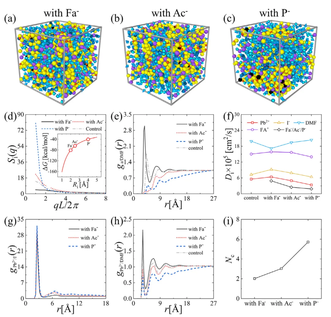 图2 (a)分别添加FAFa、(B)FAAc和(c)FAP的PbI 2/FAI/DMF前体溶液的反射MD模拟快照,其中红色、紫色、黄色、蓝色珠子表示Pb 2+离子、FA+离子、I−离子、DMF溶剂分子,黑色珠子表示添加的Fa−或Ac−或P−离子。(d)离子组分Si(q)的静态结构因子;(e)DMF分子在每个加入的阴离子周围的径向分布函数(Fa−,或Ac−,或P−)或I−阴离子。(f)各组分(D)的扩散系数。(g)I−离子的径向分布函数和(h)每个Pb 2+离子周围的DMF分子。添加的阴离子(Fa-、或Ac-、或P-)周围的邻近阳离子(Pb 2+或FA+)的数量。