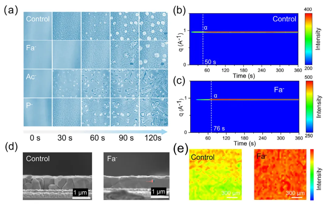 图3 (a)钙钛矿从湿膜到固体膜的成核和结晶的显微镜图像。(B)对照和FAFa基钙钛矿薄膜的横截面SEM图像。(c)对照和FAFa基钙钛矿薄膜的α相形成过程的原位GIWAXS表征。(e)一维GIWAXS(100)在面内方向上钙钛矿薄膜的μ-GIWAXS扫描。