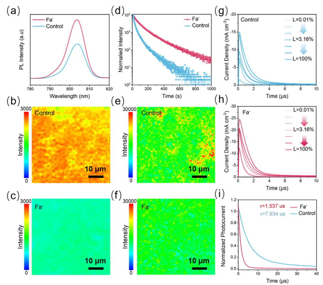 图4 钙钛矿薄膜的光电性质。(a)对照和FAFa基钙钛矿薄膜的PL和(d)TRPL衰减光谱。(B)对照和(c)FAFa基钙钛矿薄膜的PL映射。(e)对照和(f)FAFa基钙钛矿薄膜的TRPL映射。(PL映射和TRPL映射的钙钛矿薄膜沉积在SnO 2衬底上。(g)使用对照和(h)FAFa装置的CE测量在可变光强度下提取的电荷载流子密度(0.001-1).(i)完整器件的TPC曲线。