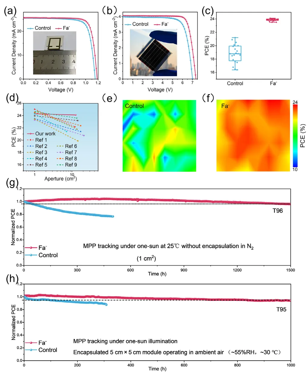 图5 (a)对照和基于FAFa的大尺寸器件(1cm 2)的J-V曲线。(B)对照和基于FAFa的PSM的J-V曲线(5 cm × 5 cm,(c)控制和基于FAFa的微型模块的PCE的统计。(d)最近出版物和我们的工作中从大尺寸器件到模块的效率降低的总结(详细信息见表S4)。(e)对照品的PCE分布和(f)基于FAFa的(基板的尺寸为5 × 5cm 2,PCE测试的有效面积为0.05 cm 2)。(g)用于对照和基于FAFa的装置的未包封PSC在白色LED灯下的操作稳定性(h)用于对照和基于FAFa的装置的封装PSM在环境空气(30 ° C和55%RH)中在白色LED灯(AM 1.5G照明)下的操作稳定性。