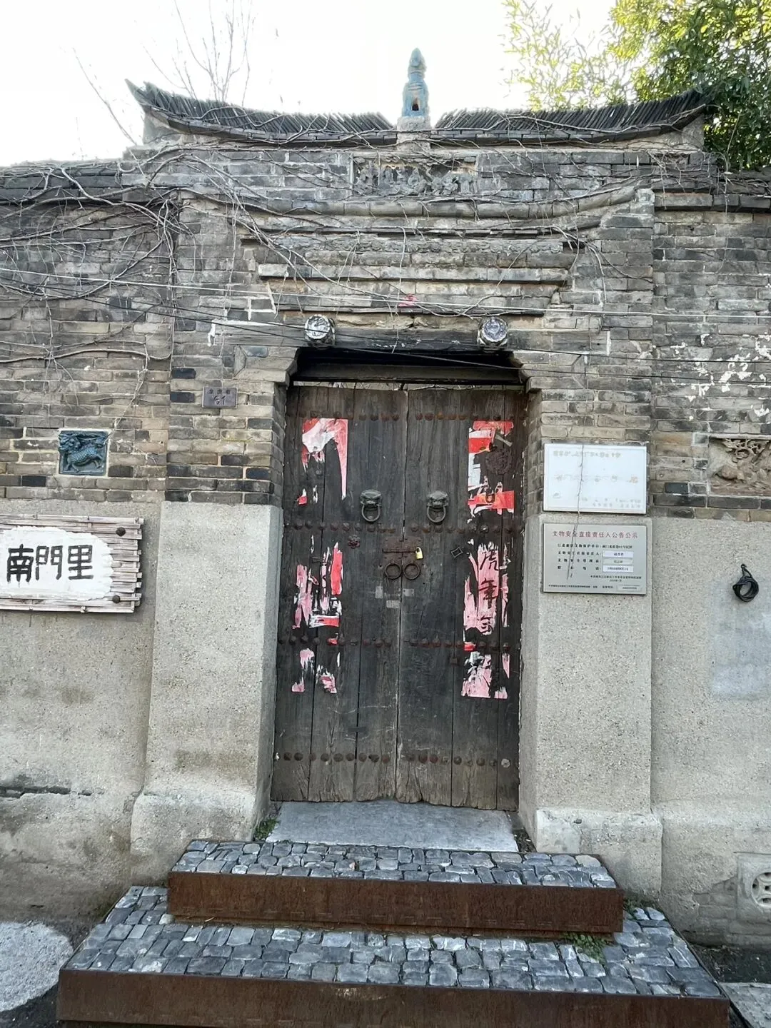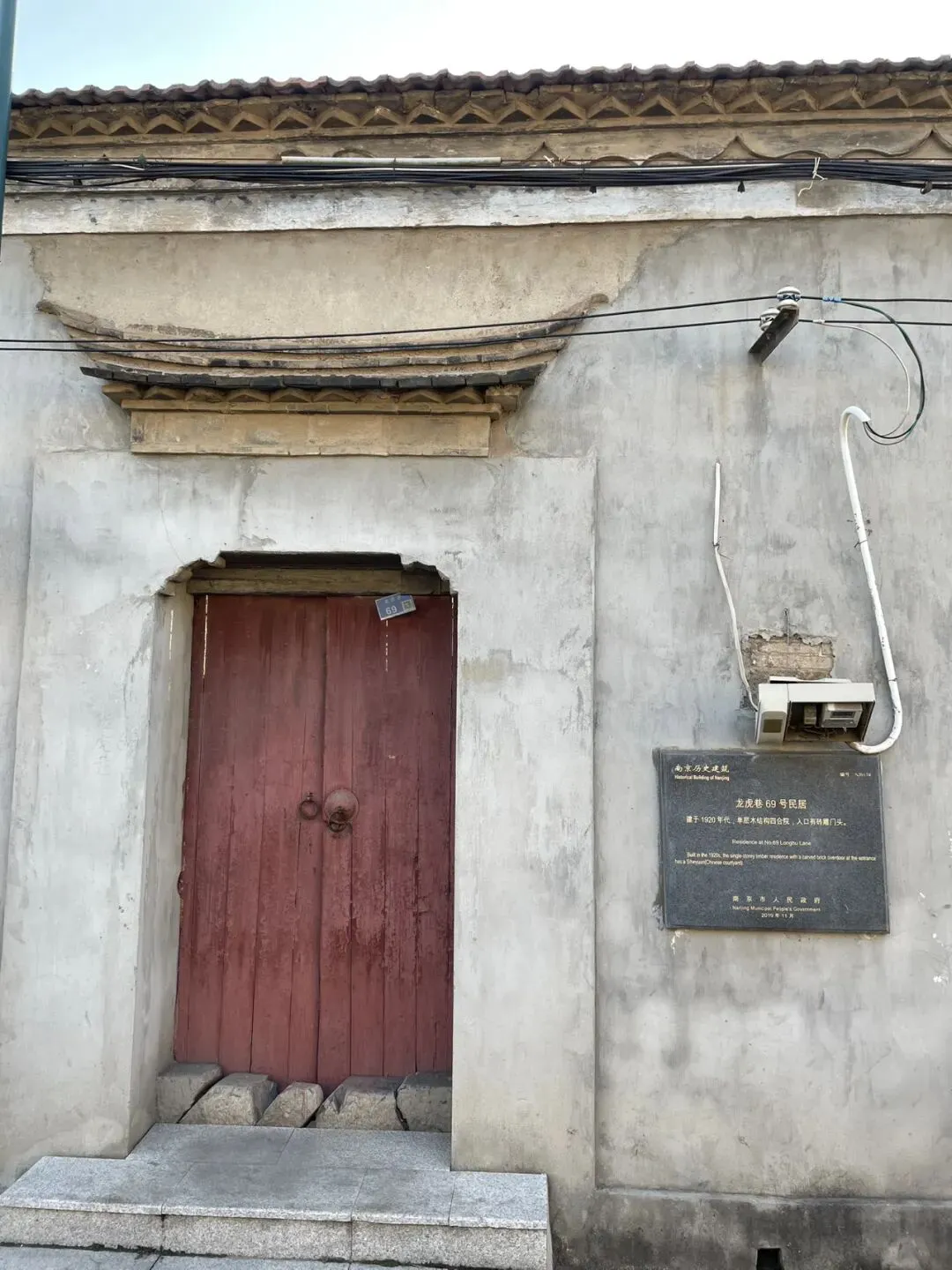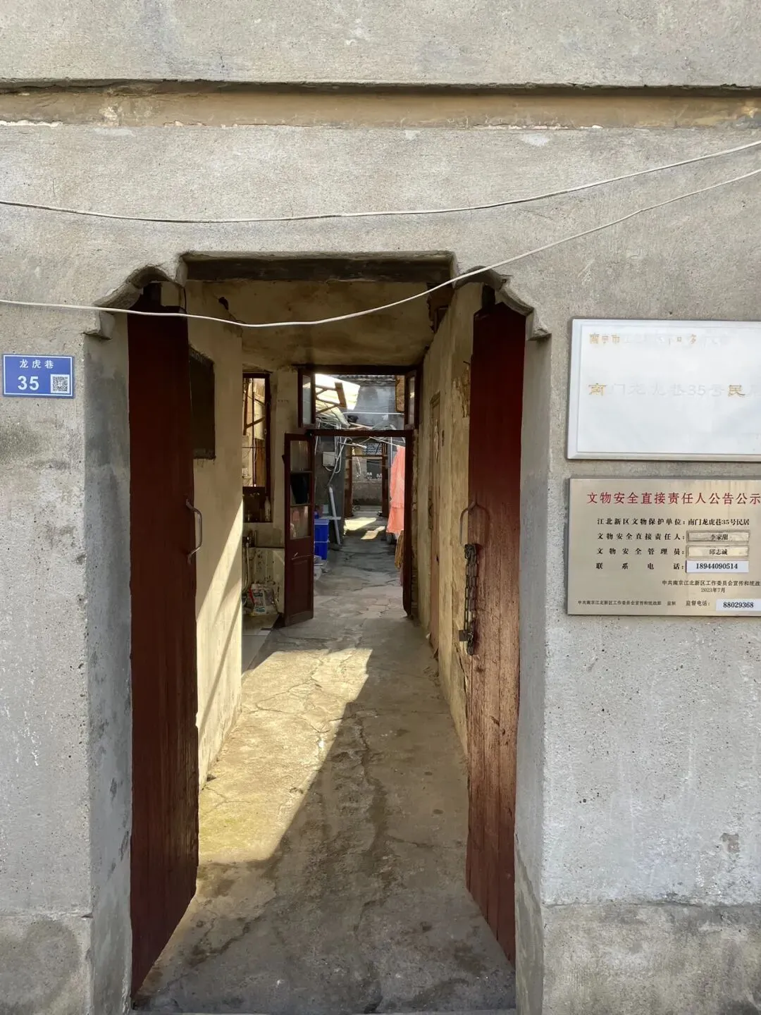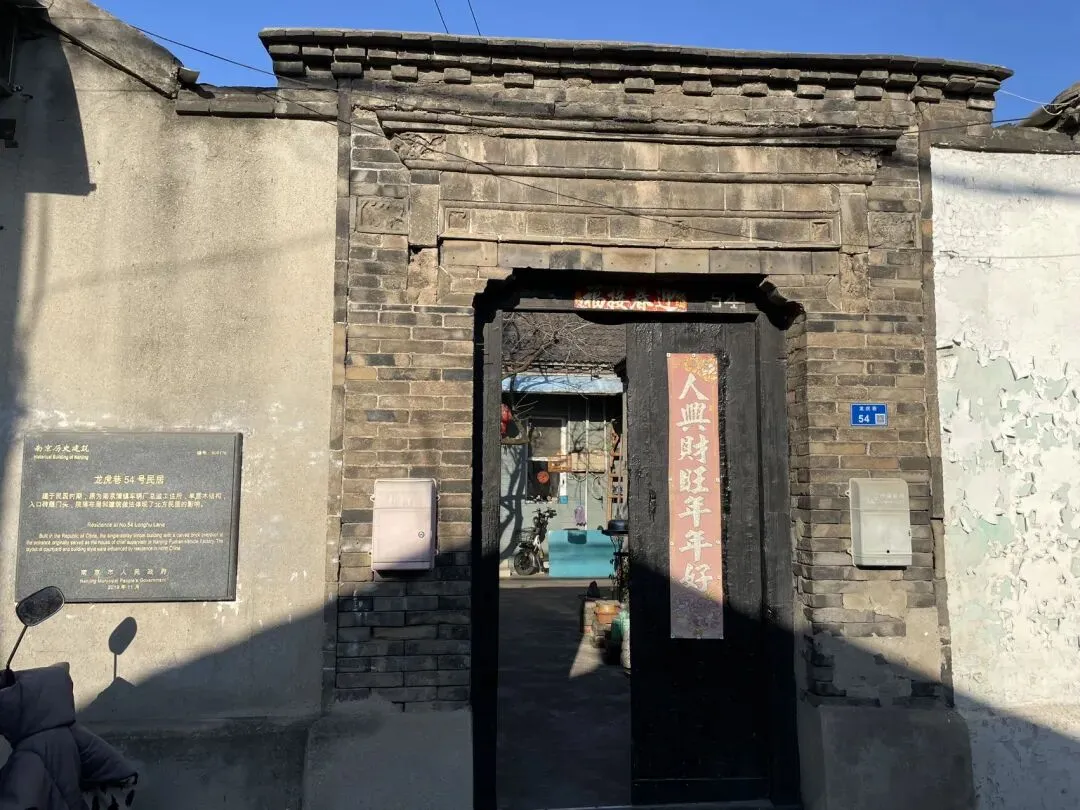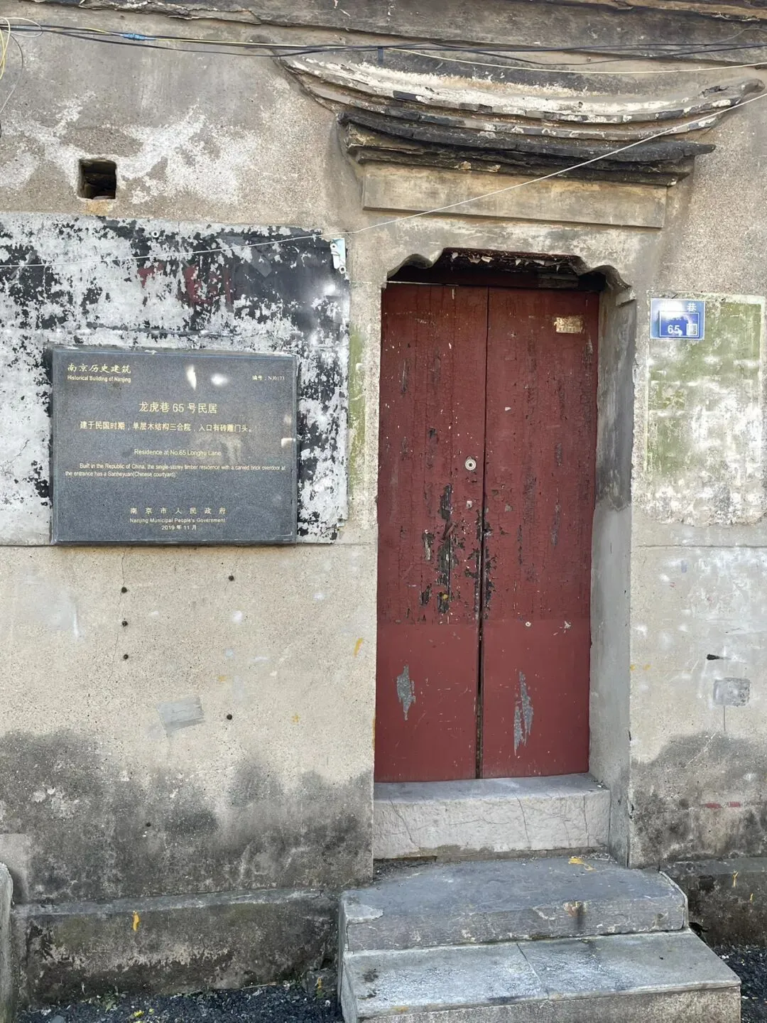 走在龙虎巷,抬头看门楼成为一种必要。这里有独立式门楼,砖雕精美,飞檐翘角,气派威严;更多是随墙式门头,青砖砌出檐口,朴素坚实。几乎每扇门都不同,厚重的实木门板,锈迹斑斑的铁环,门楣上偶尔残留的砖雕花纹。许多门边上挂着“南京历史建筑”的铭牌,编号、年代、原主人信息刻在牌子上,是建筑的身份证。
