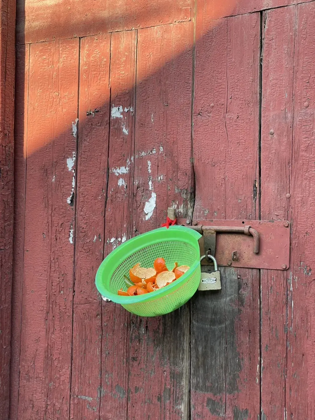 但比铭牌更生动的,是门上的生活。一户人家门楣下挂着一篮橘子皮,橙黄的颜色在青砖背景上格外醒目。这或许是北方习俗的残留。橘谐“吉”,橘皮驱晦,祈求家宅平安,百年前从北方带来的习惯,在这个长江边的巷子里延续。