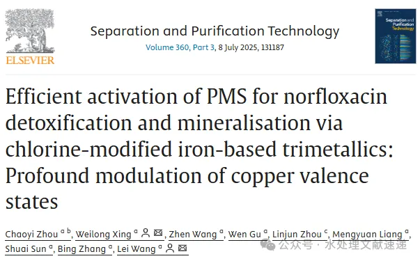 Chaoyi Zhou, Weilong Xing, Zhen Wang, Wen Gu, Linjun Zhou, Mengyuan Liang, Shuai Sun, Bing Zhang, Lei Wang, Efficient activation of PMS for norfloxacin detoxification and mineralisation via chlorine-modified iron-based trimetallics: Profound modulation of copper valence states, Separation and Purification Technology, 2025, https://doi.org/10.1016/j.seppur.2024.131187