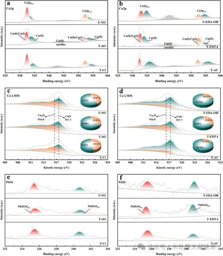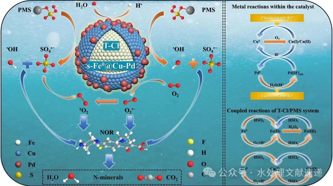 利用不同的铜源构建了六种 s-Fe0@Cu-Pd/PMS 复合材料体系,并用于降解 NOR。扫描电镜图像显示,与 T-NO、T-SO、T-EDA-OH、T-EDTA 和 T-AC 相比,T-Cl 表现出均匀的棒状结构,长度和厚度一致,形成了疏松的多孔网络。此外,氮吸附和解吸等温线表明,T-Cl 具有最高的比表面积和孔隙率。XPS、拉曼光谱和 DFT 分析证实,在富氯条件下合成的三金属催化剂中生成了 CuCl。Cl- 的引入促进了 CuCl 的优先形成,CuCl 随后水解生成额外的 Cu2O。Cu(I) 比例的增加增强了 PMS 的活化,从而提高了 T-Cl/PMS 体系中 NOR 的降解效率。在最佳条件下,T-Cl/PMS 系统对 NOR 和 TOC 的最大去除率分别为 96.25 % 和 55.87 %。此外,反应后溶液的生物毒性也显著降低。EPR 表征和淬火实验表明,在 T-Cl/PMS 系统中,SO4-是降解 NOR 的主要 ROS。据推测,Cu 位点促进了 PMS 和 O2 的活化,从而产生了多种活性物种,包括 SO4--、-OH、O2--和 1O2。TEM 和 HAADF-STEM 显微照片以及元素线扫描剖面图阐明了钯在铜位点上的原位生长。因此,钯位点产生的 H- 促进了 Cu0/Cu(I) 的再生,从而维持了 T-Cl/PMS 系统的高催化活性和可回收性。最后,根据 LC-MS 鉴定出的中间产物,提出了 NOR 的三种潜在降解途径。s-Fe0@Cu-Pd/PMS复合系统在高级去除难降解污染物方面具有巨大潜力。