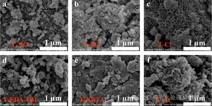 Fig. 1. SEM images of different s-Fe0@Cu-Pd catalysts: (a) T-NO, (b) T-SO, (c) T-Cl, (d) T-EDA-OH, (e) T-EDTA, and (f) T-AC.