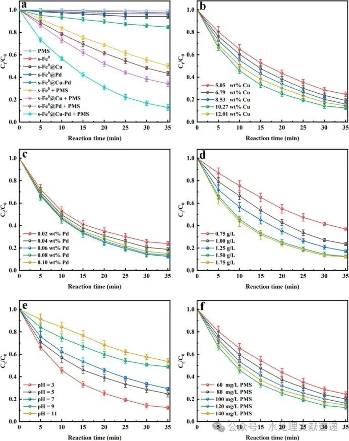 在本研究中,诺氟沙星(NOR)被选为目标污染物,它是一种广泛使用的难降解喹诺酮类药物[27]。研究人员采用顺序置换法合成了 s-Fe0@Cu-Pd 三金属催化剂,随后利用这种催化剂有效地激活了过一硫酸盐 (PMS) 以降解 NOR。研究人员系统地考察了来自不同铜源的六种不同阴离子对 s-Fe0@Cu-Pd/PMS 系统催化性能的影响。值得注意的是,氯离子表现出卓越的性能,在最佳条件下,NOR 的最大降解率达到 96.25%。在氯离子干预下合成的催化剂表面生成了 CuCl,并推测了生成 Cu2O 的另一种途径。通过改变合成过程中氯离子的添加量,成功实现了对催化剂内部铜价态的调节。此外,我们还阐明了该复合体系的催化机理,并提出了 NOR 的三种降解途径。据我们所知,这项研究是首次将基于 ZVI 的三金属与强氧化剂复合系统结合用于去除污染物。