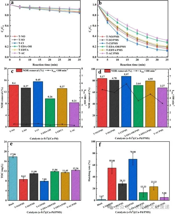 Fig. 3. Catalytic performance of single s-Fe0@Cu-Pd trimetallic particles (made from various copper salts) system and pure PMS (a), s-Fe0@Cu-Pd/PMS composite system (b) for NOR. The corresponding kobs of s-Fe0@Cu-Pd trimetallic particles (made from various copper salts) system and pure PMS (c), s-Fe0@Cu-Pd/PMS composite system (d) for NOR degradation. TOC content in solution (e) and acute biotoxicity toxicity experiments (f) after reaction of different trimetallic catalysts with PMS.