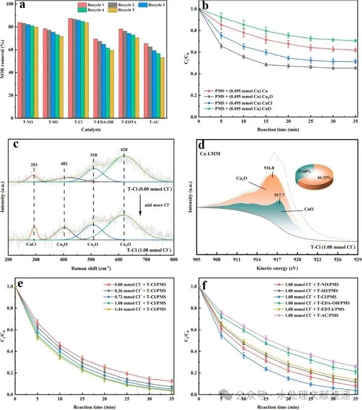 Fig. 6. Cyclic stability of the s-Fe0@Cu-Pd samples (a), degradation performances of NOR by activated PMS with different Cu compounds (b), the Raman (c) and XPS (d) spectra of T-Cl catalysts. The catalytic performance of T-Cl catalysts synthesized at different Cl− ion addition (e) and various s-Fe0@Cu-Pd catalysts synthesized at the optimal chloride addition (1.08 mmol) (f) in combination with PMS for the degradation of NOR.