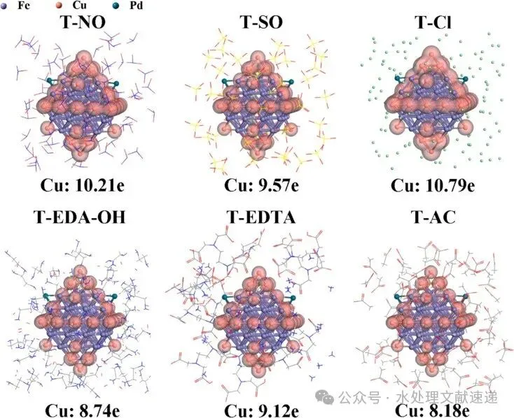 Fig. 5. Electron density profiles of Cu 3d in various s-Fe0@Cu-Pd catalysts. Fe, Cu and Pd atoms are depicted by small blue, orange and green balls, respectively.