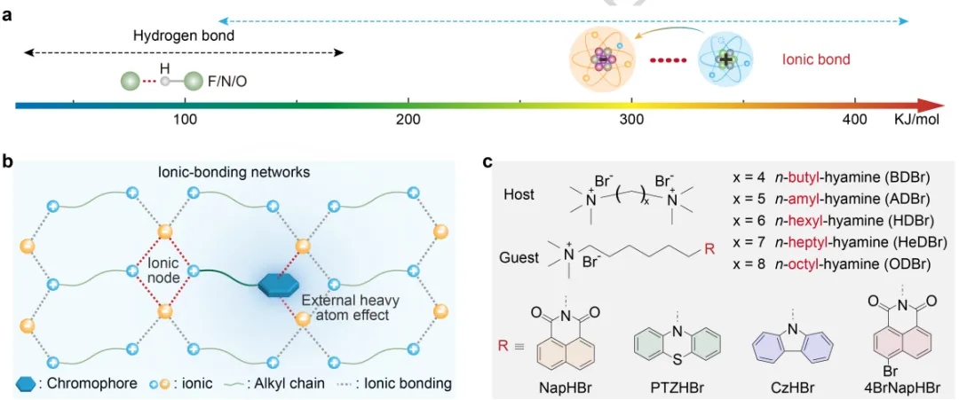 在这项研究中,研究人员提出了一种利用连续离子键构建离子键网络的主客体掺杂策略,用于制备高性能有机室温磷光材料。研究团队选用离子化的烷基链分子作为主体材料,通过将季铵基团连接到发色团上制备客体分子,从而构建出离子型磷光材料体系。该策略的核心在于利用离子键的非方向性和不饱和特性,在主体与客体分子之间形成连续的离子键网络,有效限制客体分子的运动并抑制非辐射跃迁。研究人员系统考察了掺杂比例、烷基链长度和离子键相互作用对磷光性能的影响,发现当主体与客体的烷基链长度匹配时,能够形成高度有序的离子键网络,同时有效激发外部重原子效应。通过调控孤立的发色团结构,该体系实现了从蓝色到橙红色的多色磷光发射,其中最长磷光寿命达到572.27毫秒。单晶结构分析和理论计算表明,主体材料具有较高的单重态和三重态能级,可有效防止客体到主体的能量回传;而离子键网络通过静电相互作用将发色团固定,显著增强了体系的刚性。此外,该主体材料具有良好的通用性,适用于多种不同的客体发色团,仅需通过简单的离子化修饰即可实现。