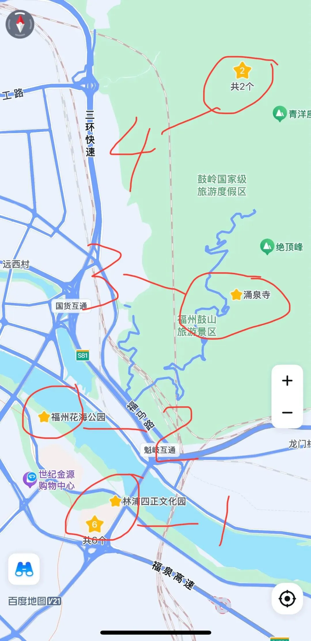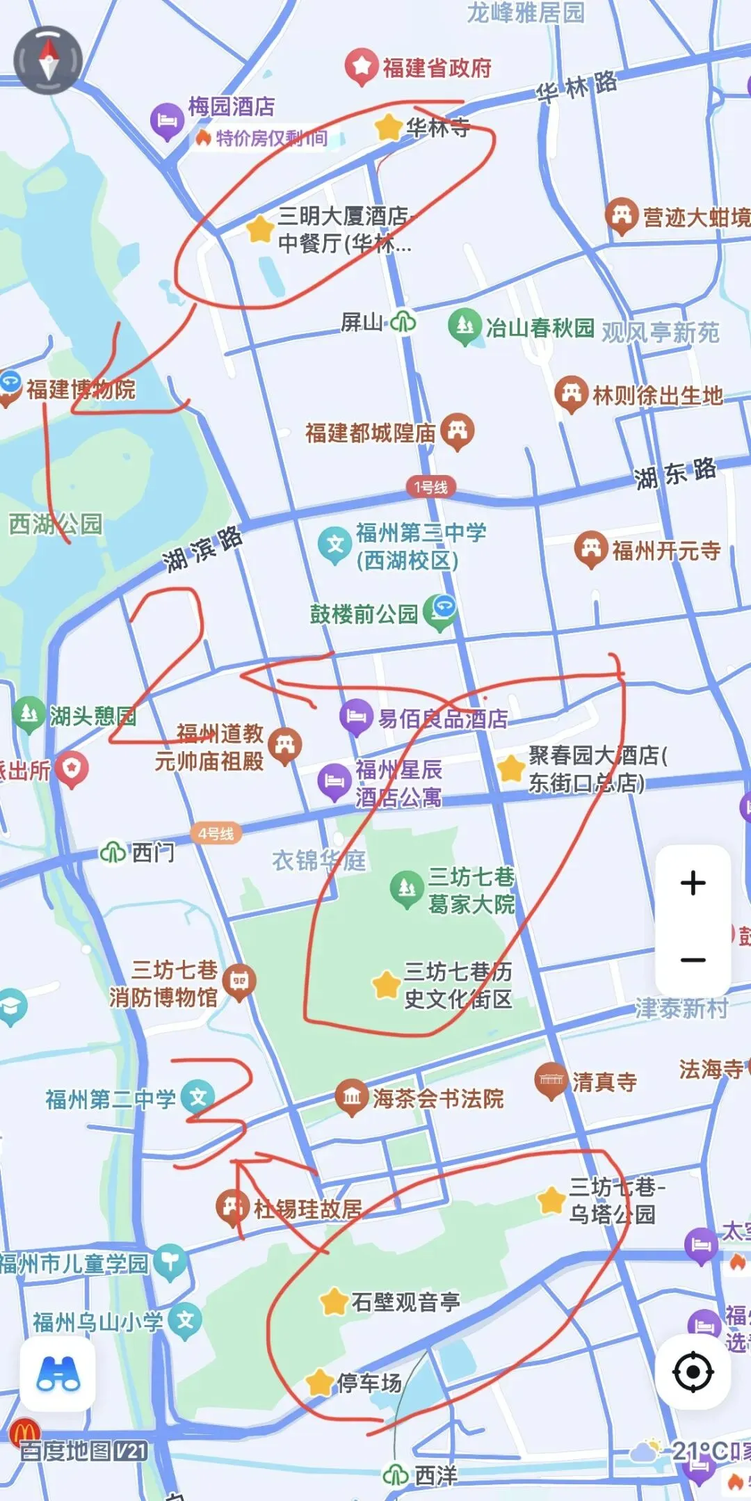 5-可以夜游烟台山、爱情岛。从福州花海公园继续向西4.5公里就是烟台山历史风貌区,这里曾经是17国领事馆聚集地,现存191栋涵盖哥特式、古罗马式等风格的近现代建筑,被誉为“万国建筑博物馆”。 叶圣陶曾描述其景致为“一座花园,一条路,一丛花,一所房屋,一个车夫,都有诗意”。 如今,这里更成功转型为集历史、文化、商业、旅游于一体的活力街区。说到烟台山,国内还有一座同名的地方,同样集聚了大批欧式建筑,甚至包括当年与丹麦那出著名地标一同铸造的小美人鱼塑像,详情点击:山海城林,融汇古今-山东行记四。 车可以停在对面的三明大厦,三明大厦的源味三明餐厅可以吃到三明地方特色菜,三明有啥特色菜?大名鼎鼎的沙县就在三明市。 2-可以游览著名的三坊七巷,这里是中国城市里坊制度活化石,这里也因为保留了159座明清古建筑,而被称为“中国明清建筑博物馆”。 3-可以游览有“一座乌山,半部中国书法史”之称的乌山历史风貌区。这里珍藏了自唐代至清代的摩崖石刻约200处 ,书体涵盖篆、隶、楷、行、草,许多出自历史名家之手,如唐代李阳冰的篆书《般若台铭》就是乌山最古老的石刻瑰宝 。漫步山间,仿佛在阅读一本立体的中国书法史卷。 2&3详情点击:三坊七巷-乌山。乌山乌塔历史超过千年,是福州现存最古老的地面建筑。 4-可以游玩福州国家森林公园,观赏树冠超过1400平方米的千年古榕,就理解为什么福州被称作“榕城”了。详情点击:福州国家森林公园千年古榕树。 三坊七巷不要错过百年美食老店同利肉燕和永利鱼丸,可以前往三坊七巷的聚春园大酒店吃佛跳墙,因为当年佛跳墙这道菜就是这家酒店发明并最先制作的。也可以前往阿弥陀佛大酒店品尝他们家的全素食自助餐,这是我吃过最好的素食自助餐。 第三条滨海线路,海岛线,可以住在马尾区或直接住到平潭岛上。 2-可以游览马尾船政文化区,包括中国船政文化博物馆,英国领事馆旧址和罗星塔公园等。