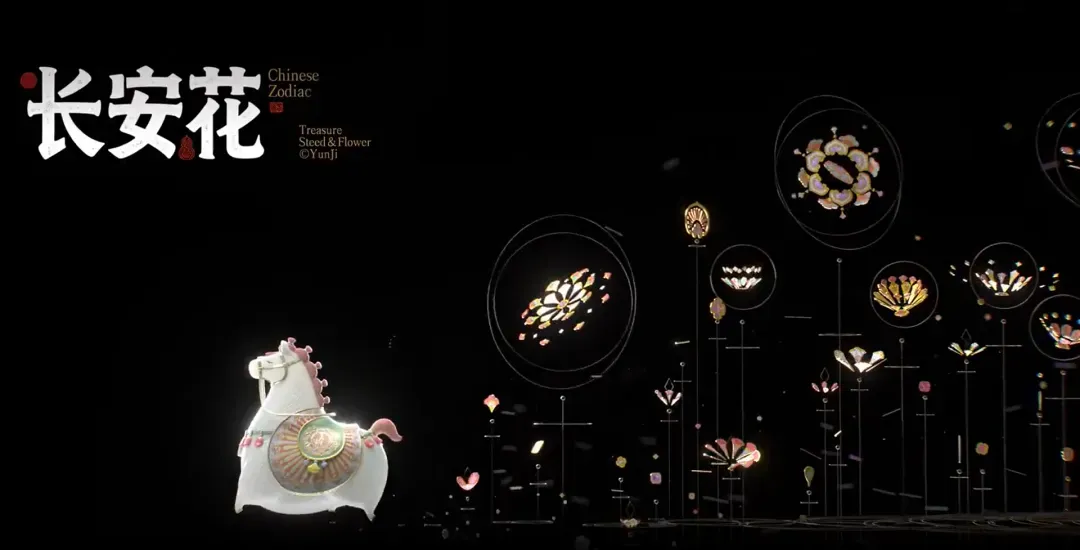 细看雕塑的每一处细节,皆是传统工艺与现代技术的完美交融,让盛唐的贵气美学在当代落地生根。它以玉石质感为基底,效仿古玉雕刻的手法塑造肌理,将战国的纹饰结构与唐代的花纹纹样揉进整体造型,古意盎然;巨型二层障泥作为画布,镶金、烧蓝、螺钿、漆艺等传统工艺一一呈现,繁复而不杂乱,尽显唐代的华丽美学;而现代技术的加持,又让这份古意有了动态的生命力,入夜灯光亮起,玉底镶金的雕塑在光影里流转,宝相花与非遗纸鸢的立体造型舒展灵动,恍惚间让人梦回长安的上元灯会,盛唐的繁华与新春的热闹在此刻相遇。设计师稻草的巧思,让这匹马跳出了单纯的生肖雕塑范畴,成了有温度、有底蕴的文化IP,正如其去年登上春晚的巳蛇IP一般,以文化为骨,以创意为肤,让传统不再遥远。