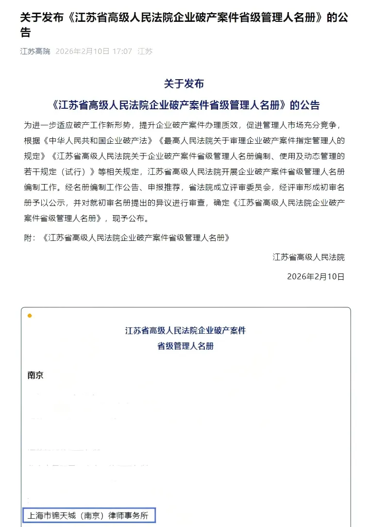 为进一步适应破产工作新形势,提升企业破产案件办理质效,促进管理人市场充分竞争,江苏省高级人民法院于2026年2月10日公示了《江苏省高级人民法院企业破产案件省级管理人名册》。上海市锦天城(南京)律师事务所凭借在破产业务领域扎实的专业素养、丰富的实务经验以及卓越的团队实力,成功入选该名册。
