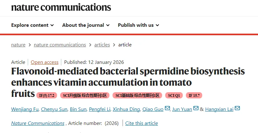2026年1月12日,西北农林资源环境学院来航线教授团队联合袁军教授在Nature Communications 发表题为“Flavonoid-mediated bacterial spermidine biosynthesis enhances vitamin accumulation in tomato fruits”的论文。阐明了黄酮类化合物介导的植物和根际微生物之间的跨界互作对番茄维生素积累的多层次调控作用与机制。