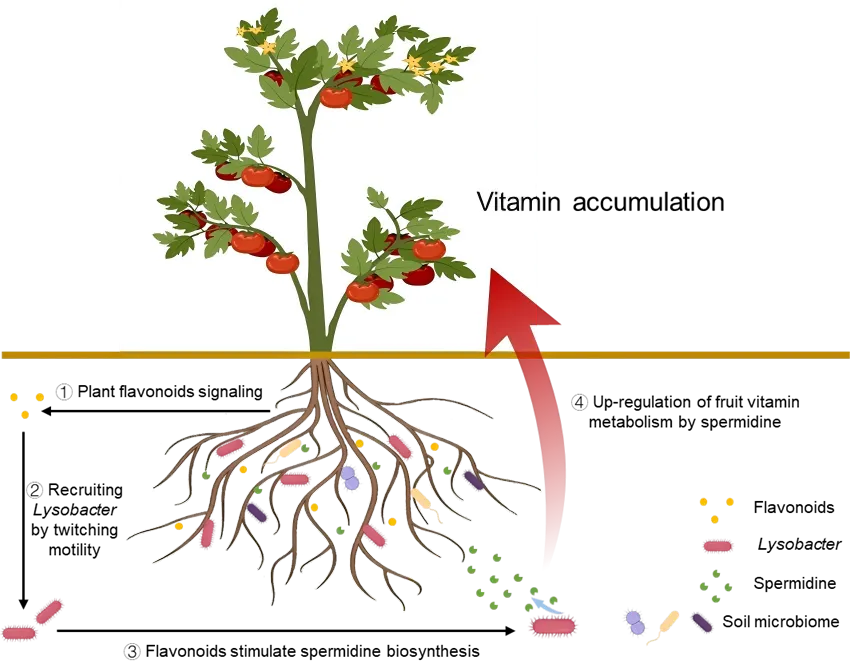 该研究发现,当番茄植株过量表达SlMYB12基因时,与生长在自然土壤中的野生型番茄相比,这类番茄果实中的维生素含量显著提高,并且会向根际土壤分泌大量的黄酮类化合物。值得注意的是,这一品质改善效果并非植物自身独立完成,而是高度依赖土壤微生物组的存在,尤其与根际土壤中溶杆菌(Lysobacter)等关键微生物类群的富集密切相关。多组学分析表明,番茄根系分泌的黄酮类化合物可通过刺激Lysobactersoli的蹭行运动“招募”溶杆菌更高效地向根系聚集;另一方面黄酮类化合物促进其亚精胺生物合成,反过来又促进了维生素的积累。进一步研究发现,溶杆菌中的RpoN扮演着“双重调控者”的关键角色。该蛋白能够感知番茄分泌的类黄酮信号,进而同步调控细菌的蹭行运动能力和亚精胺合成,最终介导微生物对果实营养提升的促进作用。这一调控路径的明确,完整揭示了类黄酮-微生物-植物果实品质之间的连锁反应机制。