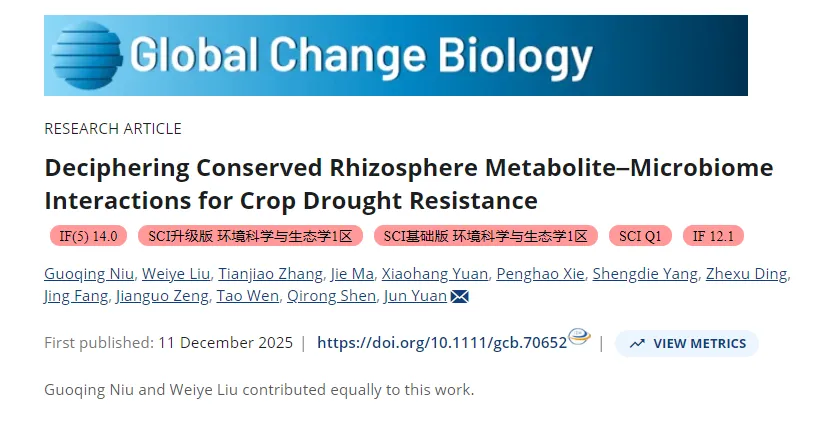 面对全球变暖和极端干旱频发,单靠灌溉和传统育种已经越来越难以支撑农业生产的可持续发展。植物根际微生物被认为是“第二基因组”,但不同作物、不同地理环境下的菌群具有差异,有没有一套跨作物保守的根际抗旱方案?目前尚不确定不同作物是否能招募微生物以助其适应干旱,以及这种招募过程如何发生。2025年12月11日,袁军教授团队在Global Change Biology期刊上发表题为Deciphering Conserved Rhizosphere Metabolite–Microbiome Interactions for Crop Drought Resistance的研究论文,研究系统鉴定了跨作物保守的干旱响应根际微生物,并揭示了三种保守代谢物(海藻糖、肌醇与苯丙氨酸)能够招募干旱响应微生物帮助多种作物适应干旱。