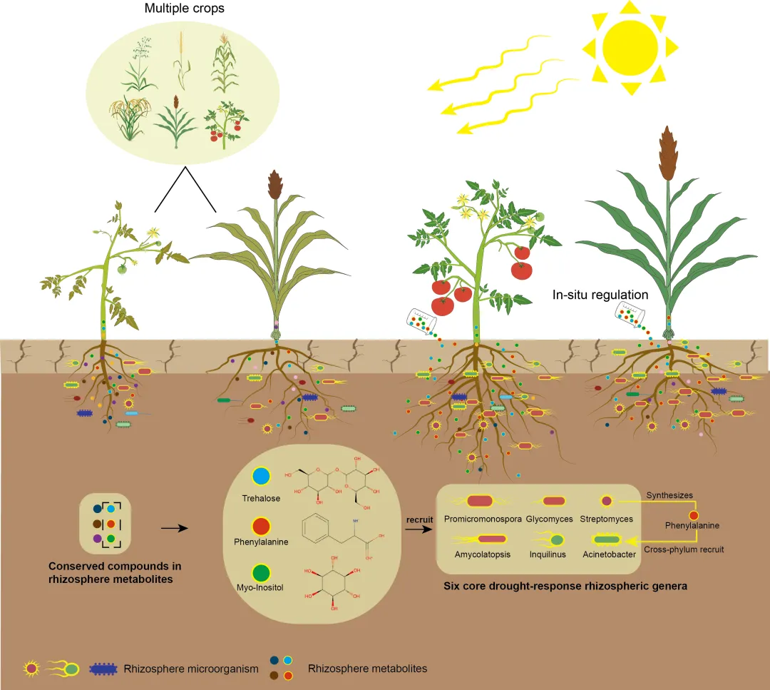 研究团队围绕干旱胁迫这一全球粮食安全难题,利用 26 种作物(涵盖单子叶/双子叶及C3/C4作物)的根际微生物扩增子数据,筛选出在干旱条件下跨作物保守富集的 6 个干旱响应微生物(Streptomyces, Glycomyces, Inquilinus, Amycolatopsis, Acinetobacter 和 Promicromonospora),并在多作物共享的 46 种根际代谢物中,鉴定出海藻糖(trehalose)、肌醇(myo-inositol )和苯丙氨酸(phenylalanine) 三种可协同富集上述干旱响应微生物的关键代谢物。以这三种代谢物原位调控根际土壤微生物组,在番茄、黄瓜、西瓜的温室试验及高粱田间试验中,均显著提升作物适应干旱的能力。同时,这些代谢物驱动了与作物适应干旱相关的功能通路富集,帮助作物抗旱。纯培养结果进一步表明,链霉菌(Streptomyces) 能利用海藻糖合成并分泌苯丙氨酸(phenylalanine)以跨门招募不动杆菌(Acinetobacter),揭示了基于代谢物可能存在的跨门级微生物级联招募机制。该研究系统阐明了一种在多种作物中保守存在的“根际代谢物–微生物”互作模式,为通过原位调控土壤微生物组提升作物抗旱性提供了新策略。