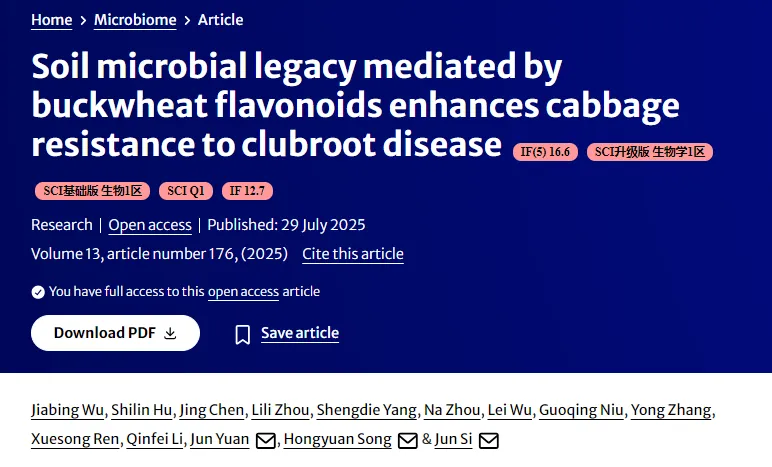 前茬作物的生长遗留效应显著影响后茬作物的健康,然而作物轮作系统中土壤遗留效应通过根际植物-微生物组互作影响抗病性的机制仍不清楚。根肿病由土传原生生物芸薹根肿菌(Plasmodiophora brassicae) 引起,对全球十字花科作物生产构成毁灭性威胁,可导致10%至90%的产量损失,且预计在气候变暖情景下危害将加剧2025年7月29日,南京农业大学袁军教授课题组联合西南大学司军教授和宋洪元研究员团队在Microbiome期刊发表了题为“Soil microbial legacy mediated by buckwheat flavonoids enhances cabbage resistance to clubroot disease”的研究论文。该研究揭示了在荞麦-甘蓝轮作系统中,荞麦通过根系分泌的黄酮类化合物塑造有益土壤微生物产生遗留效应,并通过激活茉莉酸信号通路增强后续甘蓝对根肿病的系统抗性。
