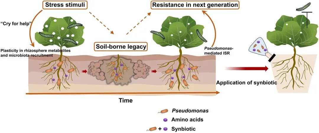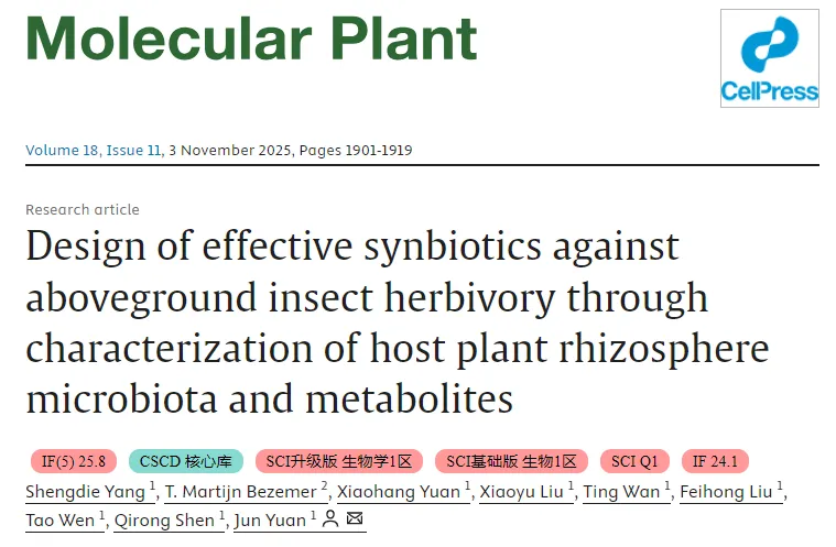 在自然界中,植物并非被动地承受外界压力,而是通过一系列精妙的生理与分子机制主动应对环境挑战。植物在遭受地上部害虫侵食时,不仅依靠叶片的防御系统作出反应,还会通过地上—地下信号传导调控根际微生物群落的重塑,构建积极的土壤遗留效应,从而增强后续植物的抗虫性。然而,植物如何通过地下根际微生物响应地上部害虫胁迫,并形成可持续的土壤记忆,仍是一个未解之谜。2025年11月3日,袁军教授课题组在Molecular Plant发表了题为“Design of effective synbiotics against aboveground insect herbivory through characterization of host plant rhizosphere microbiota and metabolites”的研究论文 。揭示了植物如何通过地上—地下互作调控根际代谢物和微生物组,实现“cry-for-help”反应,并据此设计出一种结合氨基酸与假单胞菌的高效抗虫根际合生元。