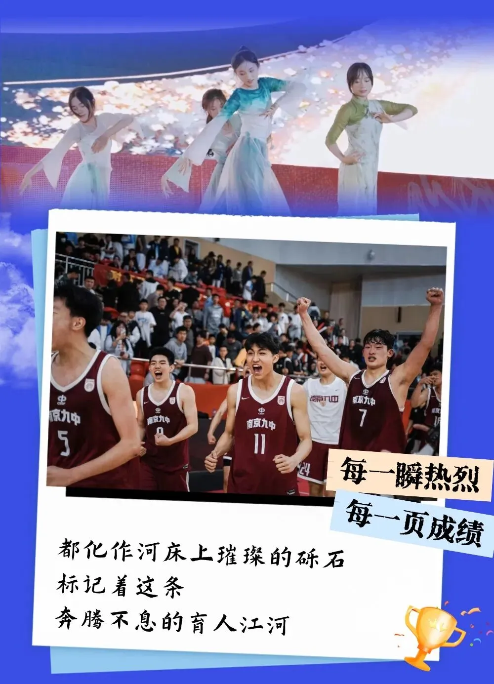 九中男篮荣获2024—2025耐高联赛东区冠军。南京九中民乐团获得全国第八届中小学生艺术展演活动一等奖;合唱团获得全国第八届中小学生艺术展演活动二等奖。艺术省统考方面,九中再次考出全省“天花板”的成绩。全省第一花落学校,全班38名同学100%过公办本科线,6位同学列居江苏省前十名,12位同学进入全省前五十名,16位同学进入全省前一百名,所有学生均被中央音乐学院、上海音乐学院、南京艺术学院等艺术名校录取。