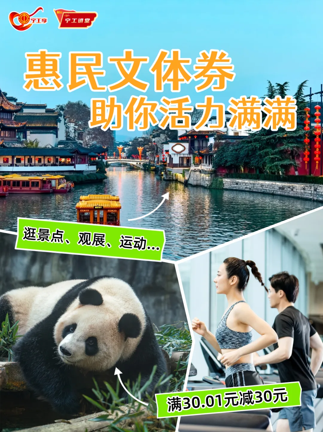 使用:消费券可享满30.01元减30元优惠,适用于红山森林动物园、夫子庙游船、大报恩寺、国际会议大酒店餐饮、南京商厦代金券、健身月卡、各类演艺演出等全市多种文体旅产品,领取后可分别在“莫愁文旅”“文客网”小程序兑换。