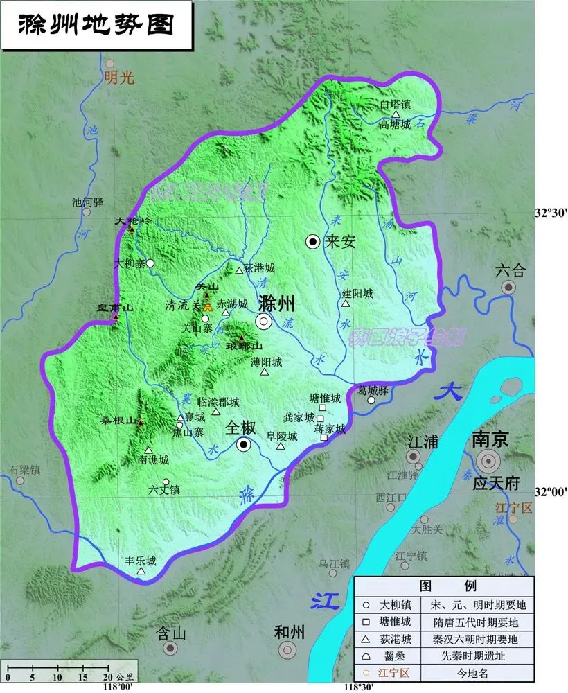 滁州位于皖东丘陵区,中西部和北部为丘陵地貌,中东部和南部是滁河水系造就的冲积平原,地质上将这一区域称为来安—全椒盆地,盆地内土地肥沃,雨量充沛,自史前起就是稻作农业垦殖区。滁州的形胜,北宋大文豪欧阳修的名作《醉翁亭记》的开篇首句,即是对其恰如其分的写照:“环滁皆山也”。顾祖禹从军事地理的角度将其阐述为:“州山川环绕,江、淮之间,号为胜地。盖北出钟离则可以震徐、泗,西走合肥则可以图汝、颍,而南下历阳,东收六合,则建康之肩背举矣。”意思是:山川环绕的滁州是长江和淮河之间的胜地,由此北出钟离(在今安徽凤阳县临淮关镇东,为淮河南岸重镇),可以威震徐州和泗州(历史上的泗水下游地区,包括今苏北宿迁市、淮安市北部以及邳州、睢宁、新沂等县所在区域);向西经合肥可以越淮河西上谋取汝、颍之地(今汝水和颍水流域的皖西和豫南一带,包括阜阳、周口、漯河、驻马店、许昌、平顶山等地);如果南下历阳(今安徽和县,为江北重镇),东取六合(今南京六合区),则等于叩开了建康城(南京)江西和江北的大门。