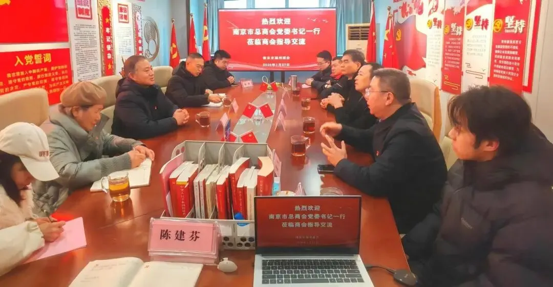 南京市工商联二级巡视员、市总商会党委书记郑德巍,专职副书记李友伟一行莅临商会指导工作。会长潘清华、党支部书记叶光明、监事长陈祥及支部成员参加座谈,汇报商会会建与党建工作情况。