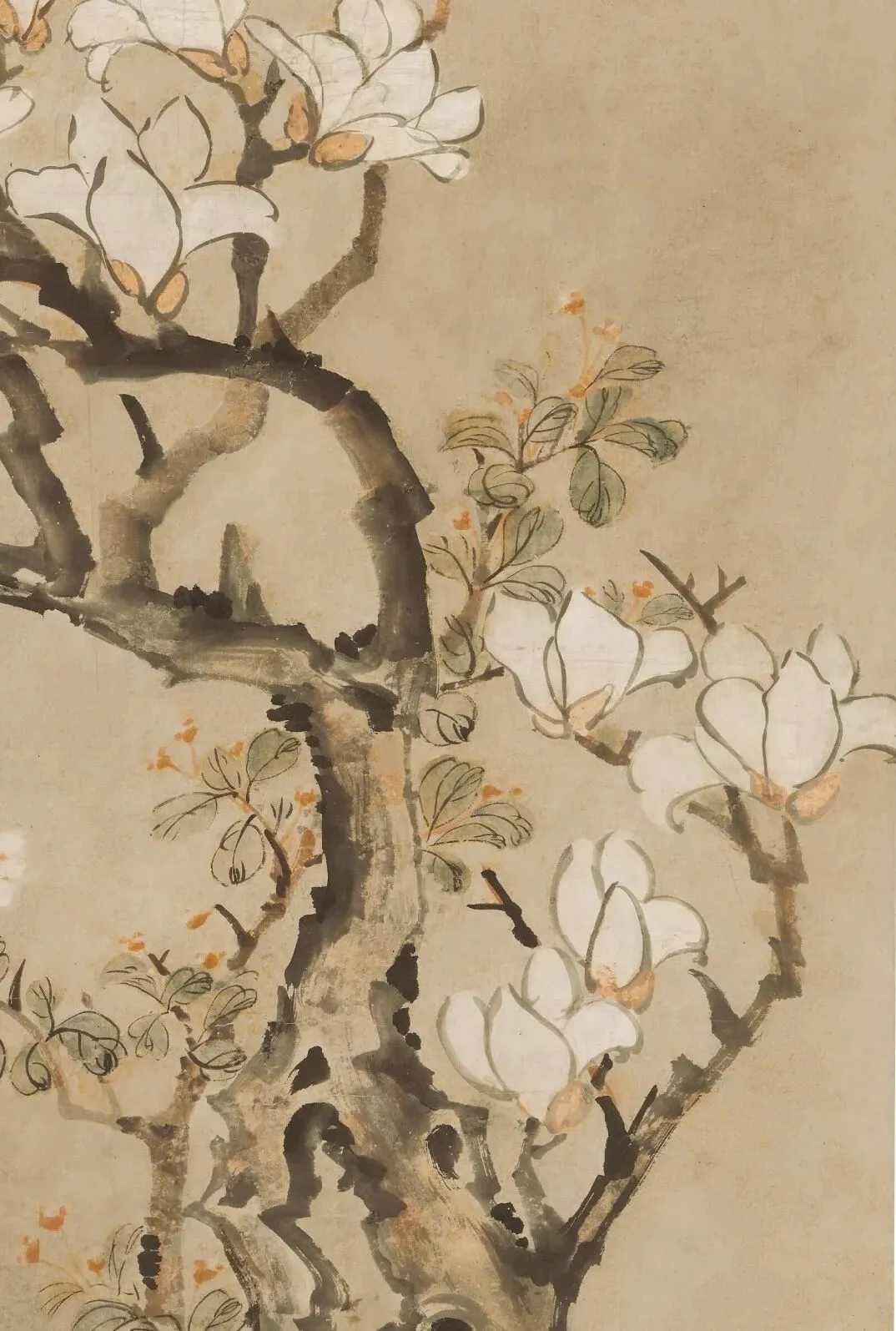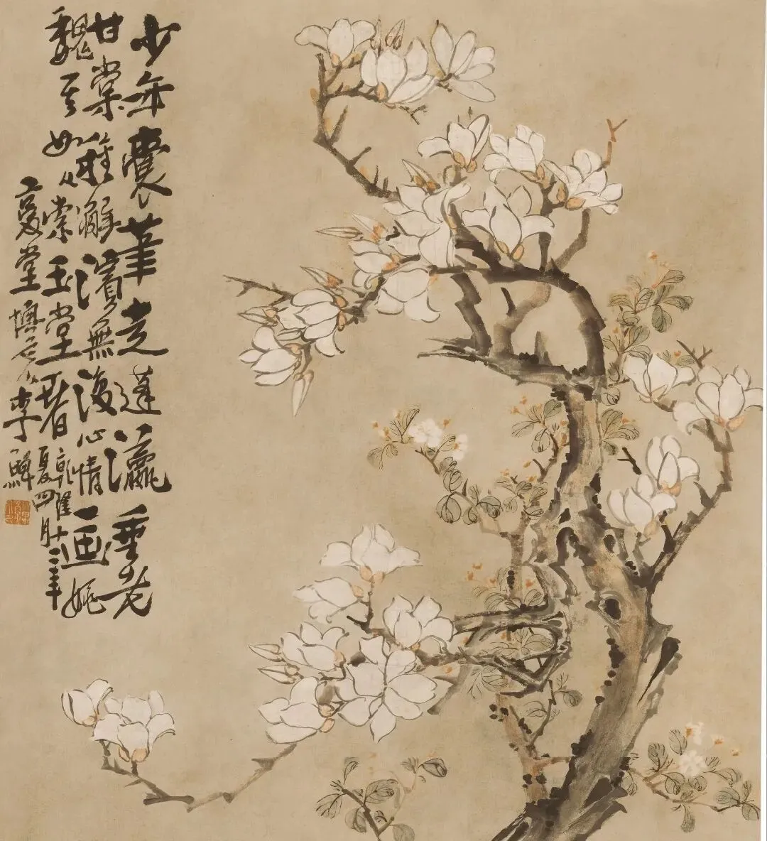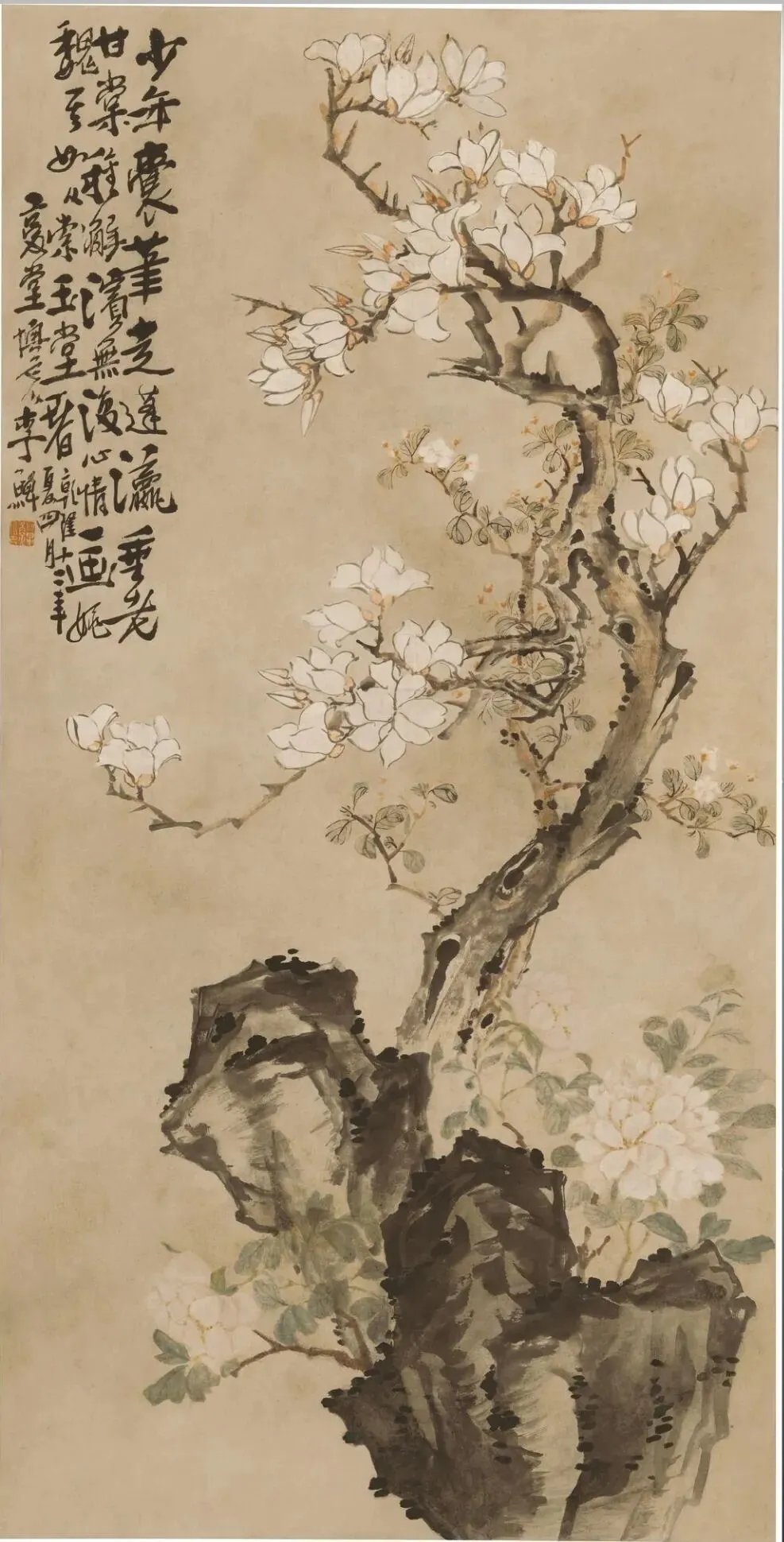 南京博物院的展厅里,这幅《玉兰牡丹图》总是能留住人的脚步。老干苍劲的玉兰斜斜伸向天际,满树白花似堆雪覆霜,石畔几枝牡丹含苞待放,淡粉花瓣晕着温柔的光泽,左侧狂草题诗笔走龙蛇。