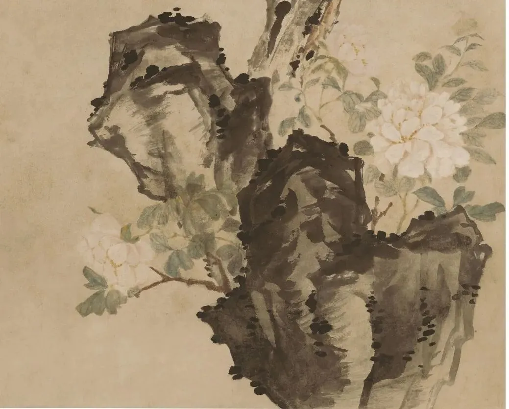 画里的细节藏着更多故事:玉兰的老干上有几处斑驳的墨点,是他酒后泼墨的即兴之作;牡丹的花瓣边缘晕着淡赭色,那是他用扬州本地的赭石研磨的颜料;连石头的皴法都带着“扬州八怪”特有的狂放,与宫廷画院的细腻工整判若两人。
