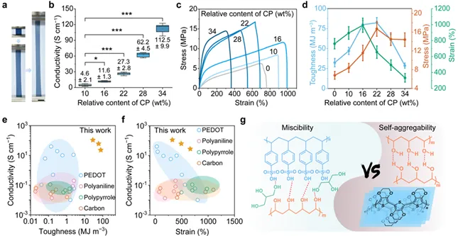 图2(a)CP-PVA有机凝胶在拉伸至原始长度10倍时的实物照片(比例尺: 15 mm)。不同CP相对含量(相对于CP与PVA总质量)的CP-PVA有机凝胶的导电性能(b)、拉伸应力-应变曲线(c)及综合性能对比(d)。拉伸测试在200% min-1的应变速率下进行。(e)(f)对比CP-PVA有机凝胶与已报道水凝胶在韧性、拉伸应变和电导率方面的性能表现。(g)CP与PVA链之间相容性与自聚集性平衡关系的示意图。