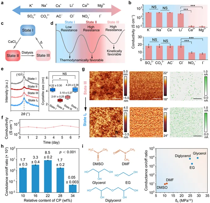 图3(a)经离子处理后,CP-PVA有机凝胶导电变化倍率对应的特定离子序列排序。(b)不同盐处理后CP-PVA有机凝胶的电导率(其中Cl-和Na+分别作为对离子)。CP-PVA有机凝胶在三种不同热力学状态之间的可逆调控示意:热力学稳定的低电阻态(State I)、热力学稳定的高电阻态(State II)以及动力学稳定的高电阻态(State III)。(e)不同状态下CP-PVA有机凝胶的XRD图谱(左),以及基于19.5°处衍射峰计算得到的平均晶粒尺寸统计结果(右)。(f)CP-PVA有机凝胶在State III状态下于环境条件中储存不同时间后的电导稳定性。(g)不同状态下CP-PVA有机凝胶的AFM表征结果:高度图(左)、相位图(中)及在隧道原子力显微(TUNA)模式下获得的隧道电流图(右)。(h)不同CP含量的CP-PVA有机凝胶的导通/关断比。(i)以不同溶剂作为分散介质制备的CP-PVA 有机凝胶的导通/关断比。