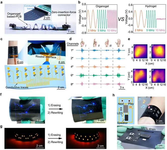 (2)水凝胶电子腕带,用于高保真肌电信号采集与手势识别:导电凝胶电路可与传统刚性电路板实现稳定互连,并在反复插拔条件下保持可靠的电学性能,且凝胶腕带能够实现高信噪比的生物电信号采集,并在形变和复杂环境下维持稳定工作。