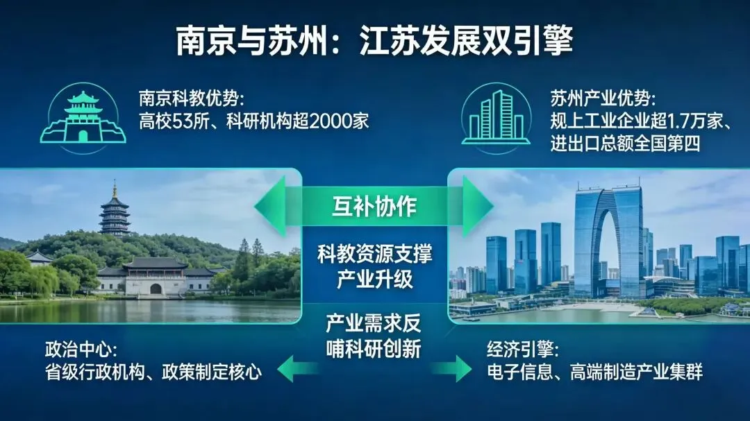 南京与苏州的差异本质上是“政治中心”与“经济引擎”的功能分工,两者共同构成了江苏“强省会”与“强经济”并重的发展策略。随着长三角一体化的深入,两市正从“单打独斗”向“组团突围”转变,南京的科教优势与苏州的产业优势形成互补,共同提升区域整体竞争力。