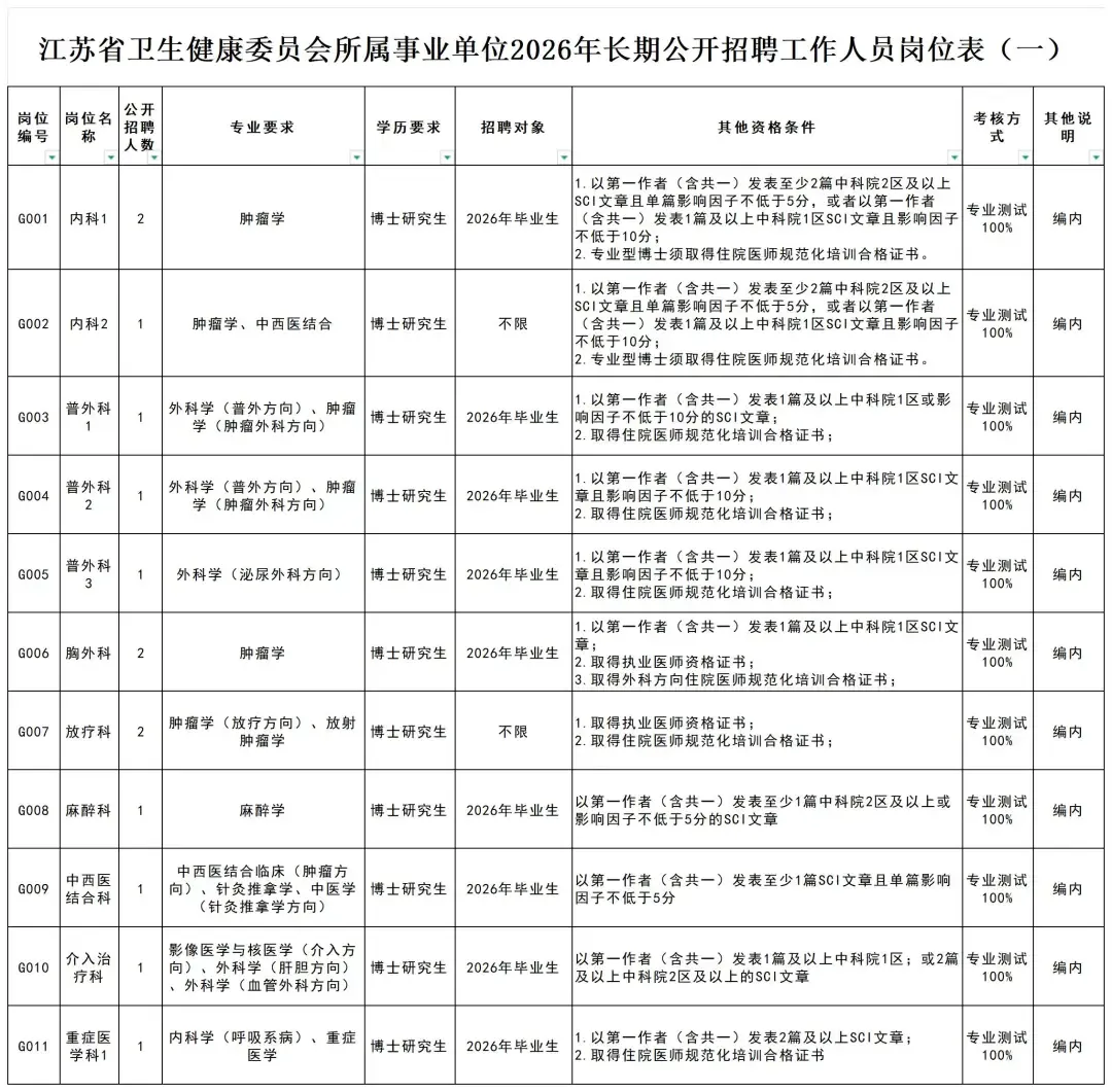 江苏省肿瘤医院2026年高层次(博士)公开招聘(32名)