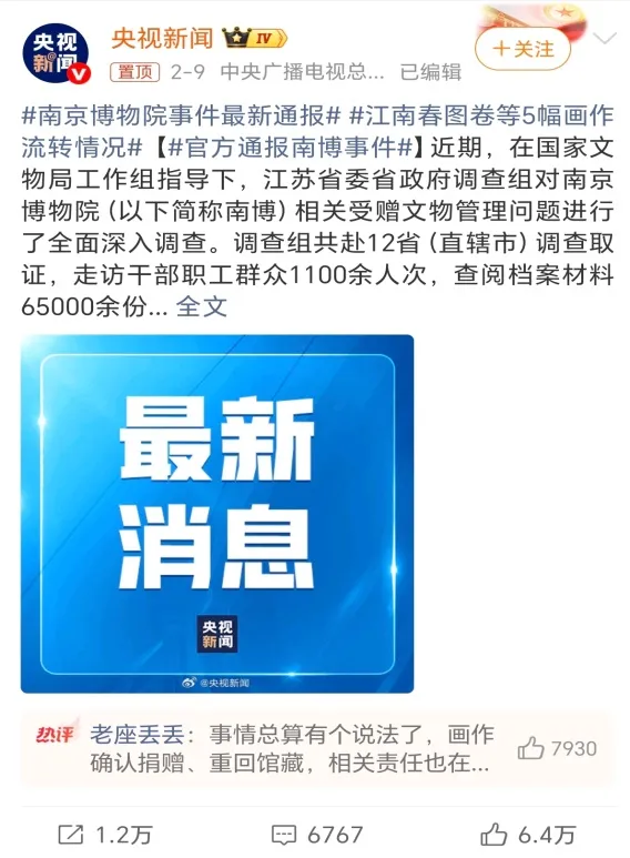 近期,在国家文物局工作组指导下,江苏省委省政府调查组对南京博物院(以下简称南博)相关受赠文物管理问题进行了全面深入调查。调查组共赴12省(直辖市)调查取证,全面追溯南博收藏的庞增和所捐赠《江南春》图卷等5幅画作去向,彻查画作调拨、流转过程中的涉嫌失职渎职等违纪违法问题。