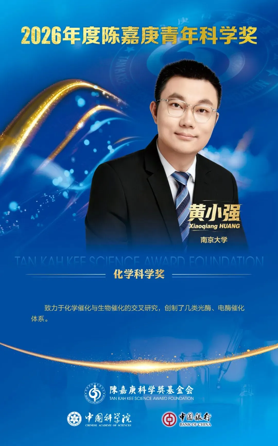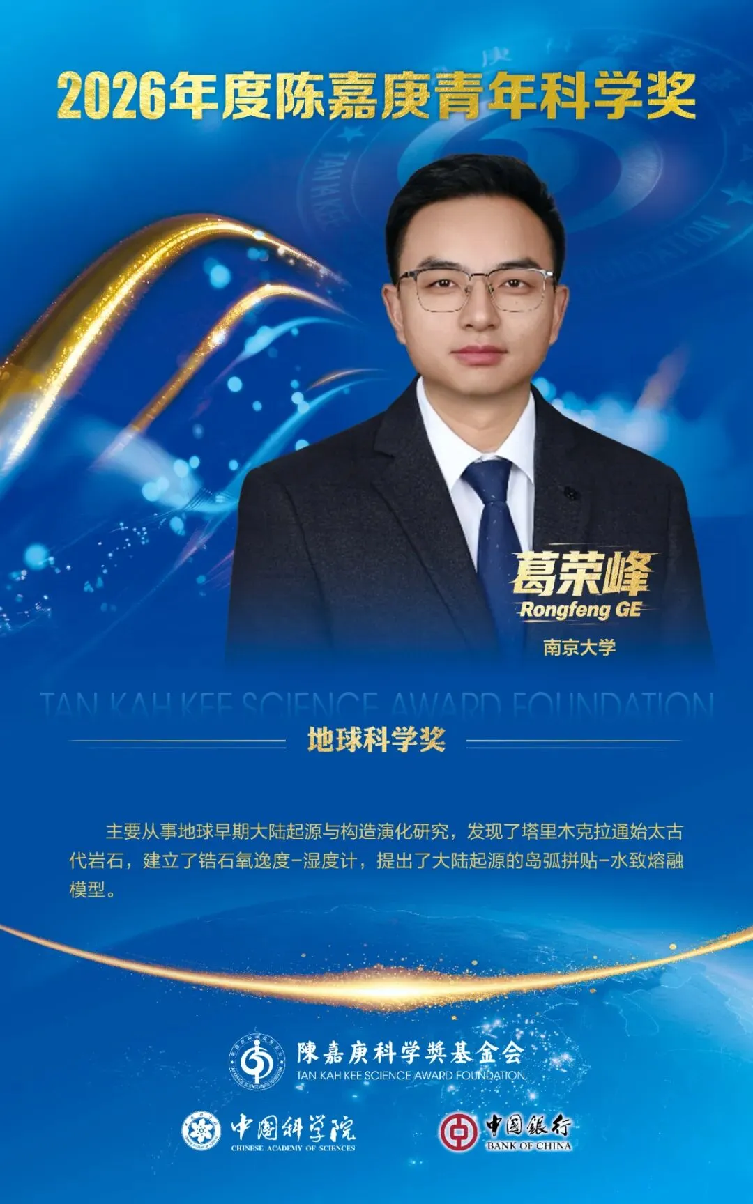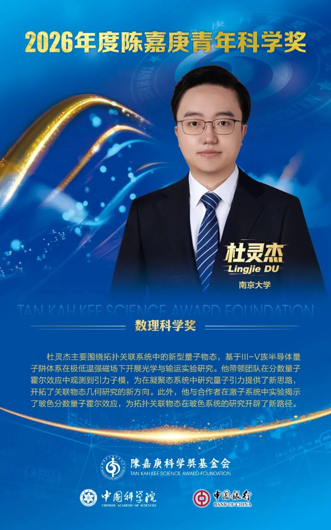 其中,南京大学物理学院教授杜灵杰、化学学院教授黄小强、地球科学与工程学院教授葛荣峰获2026年度陈嘉庚青年科学奖。