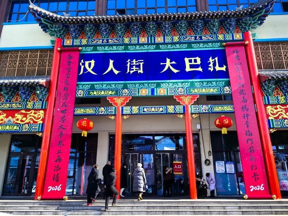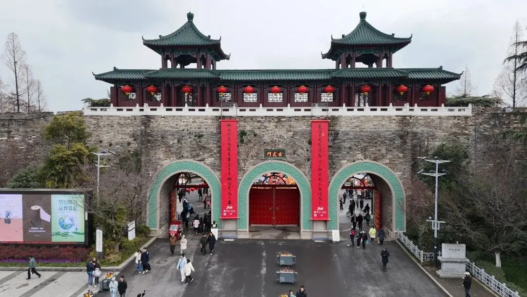 汉人街大巴扎的春联满含烟火气息,“好景记年年,抖龙马精神,幸福门前新打卡;春声喧处处,醉莺花世界,太平卷上再添诗”,这副对联由张雨琪撰写,由江苏省文联名誉主席、省艺术创作研究会会长章剑华书写,笔意洒脱、年味浓郁,将百姓对新春的美好期许与龙马奋进的精气神融入笔墨,为熙攘的街区更添喜庆。同款红联在南京太平门挂起,这里山水入城,左拥玄武湖,右倚钟山灵秀,两地民众共享这份新春的烟火福气。