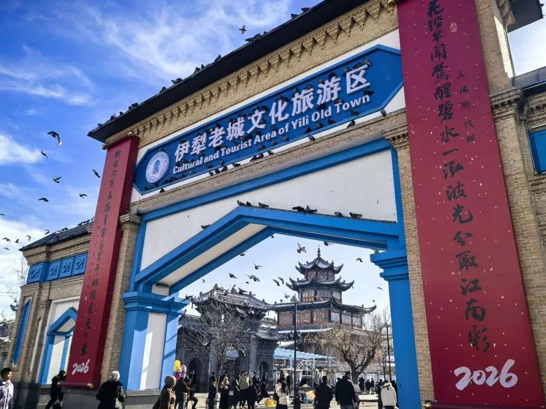 小年至,福韵浓。2月10日农历小年当天,伊犁老城文化旅游区彩门、汉人街大巴扎、丝路之光小镇、石榴花展览馆、六星街景区游客中心、手风琴展示馆、金陵文化活动中心、王蒙书屋、汉家公主纪念馆、青少年活动中心、伊宁市图书馆等伊宁市核心地标同步挂出巨幅春联。由南京书法名家挥毫泼墨创作的联墨作品,携金陵墨香跨越千里,宁伊两地同步悬挂同款春联,让江南文韵与伊犁风情完美交融,为两地春节绘就浓浓年味,更以春联为媒,搭建起宁伊两地文化交流的坚实桥梁。