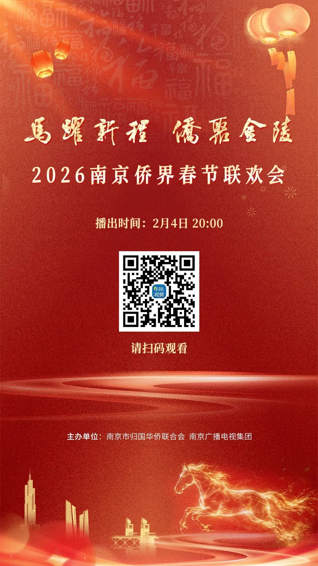 骏马启新程,侨心汇金陵。2月4日,“马跃新程・侨聚金陵”2026南京侨界春节联欢会圆满落幕,四海侨胞通过线上线下欢聚一堂,共绘新春盛景,共叙家国情怀。值此新春佳节来临之际,南京市侨联特推出春节联欢会精彩节目系列展播,每日解锁一段侨界年味,赏金陵灯彩、品非遗雅韵、听侨声欢歌,让浓浓春意与暖暖侨情,伴您共度祥和新年!