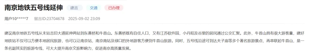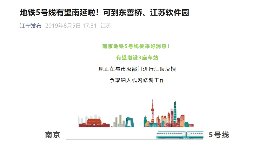 又有网友在人民网建议地铁5号线延伸从末站吉印大道延伸两站到东善桥和牛首山。建议南京地铁五号线从末站吉印大道延伸两站到东善桥和牛首山。东善桥既有自住人口,又有江苏软件园,小丹阳及谷里的居民通过公交汇聚。此外,牛首山具有很大游客量,建好地铁站不仅可以方便本地居民旅游,也可以让南京站,南京南站及禄口的外地游客方便到牛首山旅游。同时,五号线沿途可到达夫子庙等多个著名旅游景点,再串联起牛首山,是一条名副其实的旅游专线,可大大提升南京文旅影响力,促进南京高质量发展。轨道交通是城市重大基础设施工程,其线路走向和站点设置须根据城市国土空间总体规划,综合沿线开发情况、客流需求特征以及工程实施条件等诸多因素,科学合理确定。 根据南京市轨道交通线网规划,地铁5号线北起方家营站,南至江宁吉印大道站,主要提供下关滨江、南部新城、东山老城以及江宁九龙湖等地区间的轨道服务,是城市南北向轨道交通干线。目前全线已通车运营,在江宁区范围内与1、3、S1号线等轨道线路衔接换乘,进一步提升区域内线网功能,增强轨道服务水平。 东善桥位于南京绕城高速以南、宁丹大道沿线,属于秣陵街道西部的科研居住组团,现阶段市民可通过地铁5号线、S1号线与其他交通方式的衔接换乘实现轨道交通出行需求;牛首山位于东善桥以北,规划有地铁12号线覆盖服务,目前正在开展各项前期研究工作。南京地铁将结合东善桥、牛首山及周边地区规划发展情况进一步深化研究,力争为市民提供更优质、便捷的出行服务。 感谢您对南京轨道交通建设工作的关心和支持,欢迎您继续关注南京地铁的发展。祝您工作顺利,万事如意!2017年和18年微滨江公众号曾经发布推动两条新的地铁延伸