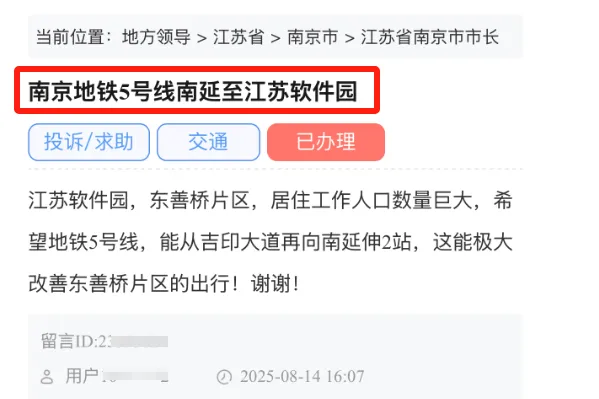 随着5号线的开通,5号线南延的呼声此起彼伏。也有南京网友在网络问政平台留言,希望“南京地铁5号线南延至江苏软件园”。